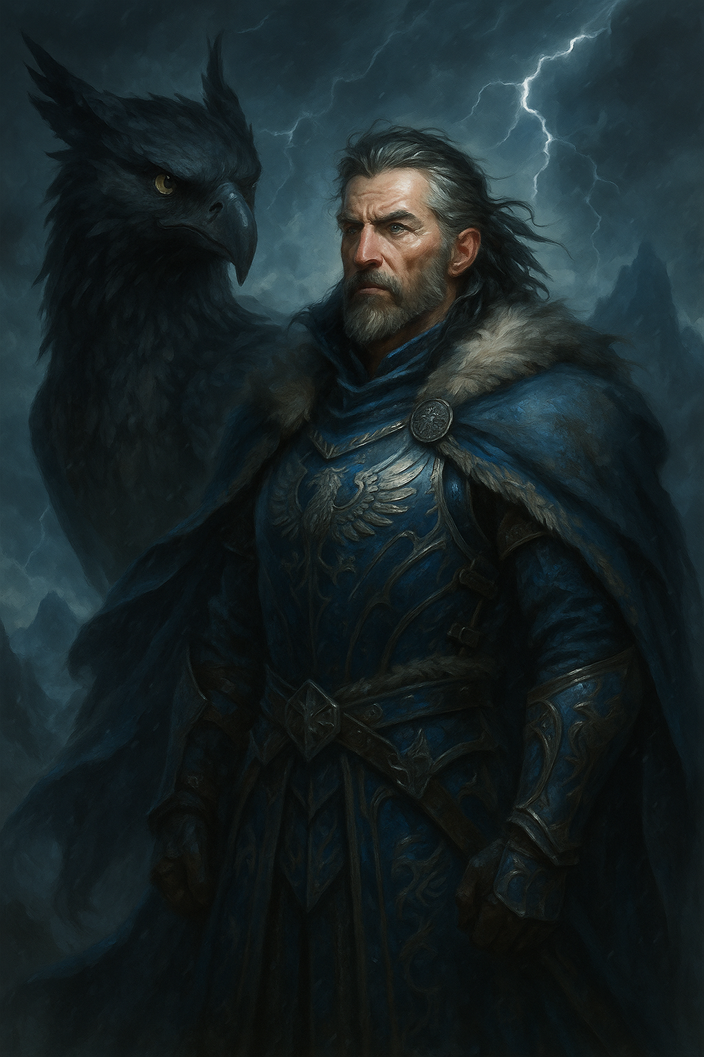 Griffon: Thaloryn, a black-feathered griffon with silver-tipped wings.
